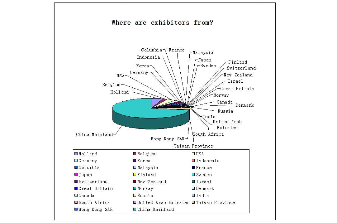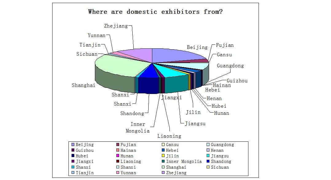 Geographically speaking, as far as Mainland China is concerned, exhibitors were from most provinces and regions across the country. Apart from East China, 41% of domestic exhibitors were from Southern, Northern, South West, North East, North West and Middle part of China.